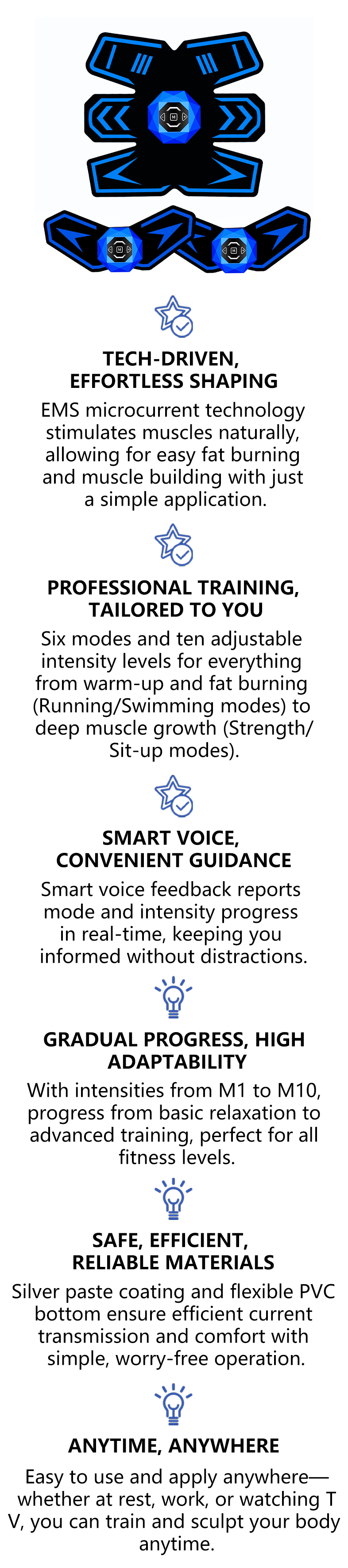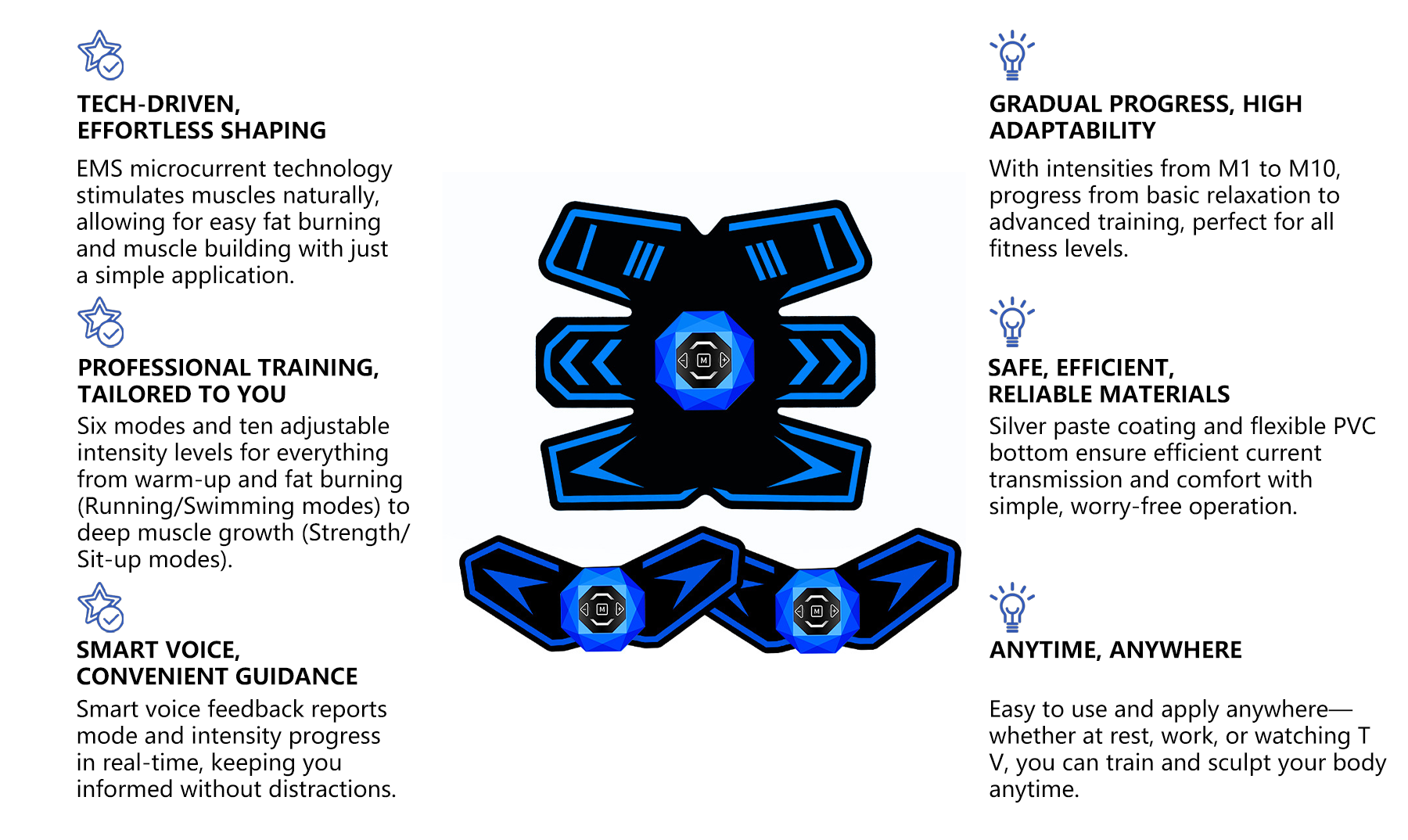 - Six Modes - Six modes to meet different workout needs, from fat burning to muscle building, all in one device.